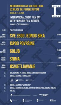 U sklopu ovog događaja prikazat ćemo filmove: SVE ZBOG JEDNOG BIKA reditelja Emira Solakovića, ISPOD POVRŠINE rediteljice Maje Ćetojević, GOLUB reditelja Vuk Popović, SNIMA Fedora Marića i film OSVJETLJAVANJE Mine Vavan, inače studenata Akademije scenskih umjetnosti Univerziteta u Sarajevu i Akademije umjetnosti Univerziteta u Banjoj Luci. I ove godine će publika igrati veliku ulogu u ovoj svečanosti, jer će svojim glasovima odabrati najbolji bh. kratki film u ovoj godini!